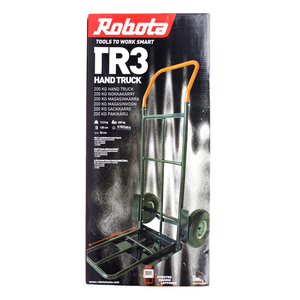 The Robota TR3 is a heavy-duty, handy hand truck that is well suited to handle heavy loads in garages, warehouses, or on the job site. The TR3 is delivered as a package and it is simple to assemble. With solid rubber tires and a steel frame, it glides easily and delivers consistent performance in harsh environments
